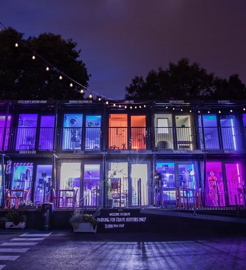 Flexwood supplied and installed 36 sets of Reynaers Aluminium CP155 Sliding doors and CS68 Hinged PAS24/Secured-by-Design rated entrance doors to the front and back of each 40' container in this exiting development. For Costa Coffee unit, we supplied and installed doors and fixed glazed screens. which was the brainchild of Crate founder Adam Walker.
